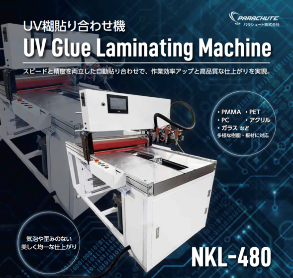 2025年10月20日よりパラシュート株式会社がPET素材の印刷物とアクリル板を接着させるUV糊貼り合わせ機(NKL-480)の提供を開始しました。本機械を導入することでお手持ちのデジタル印刷機でアクリルキーホルダー関連の商材を、インクジェットプリンターに比べ大量生産が可能となります。